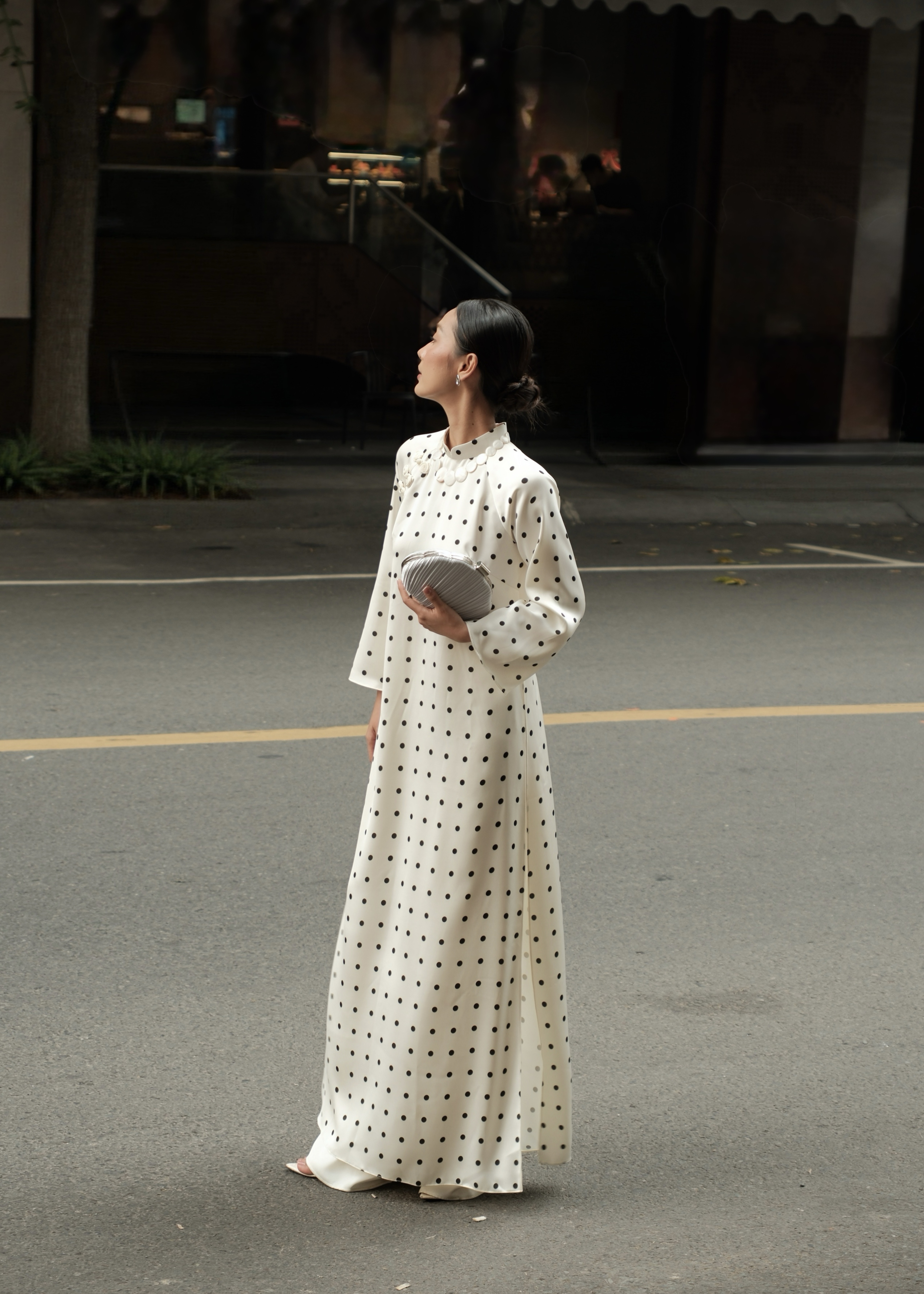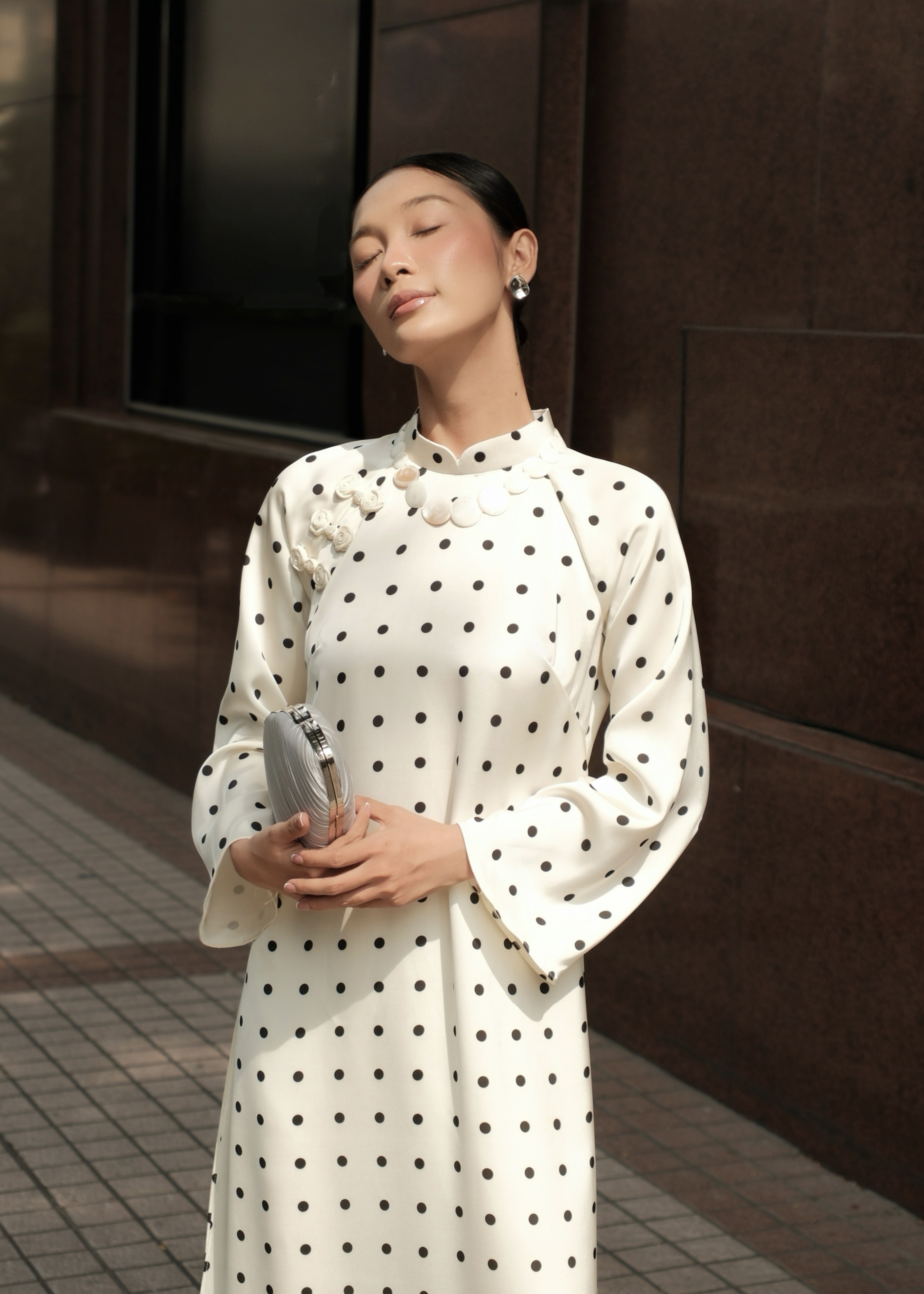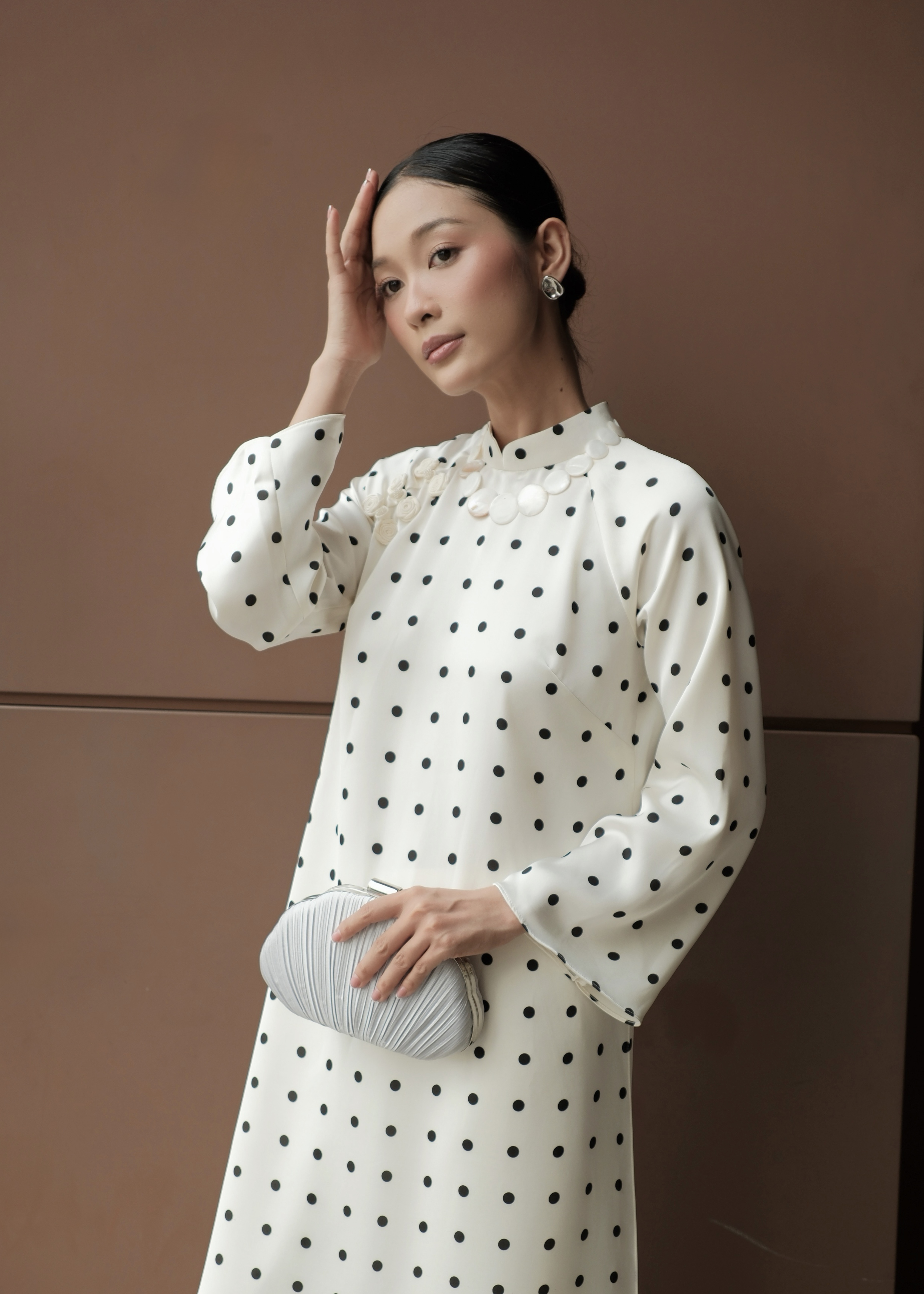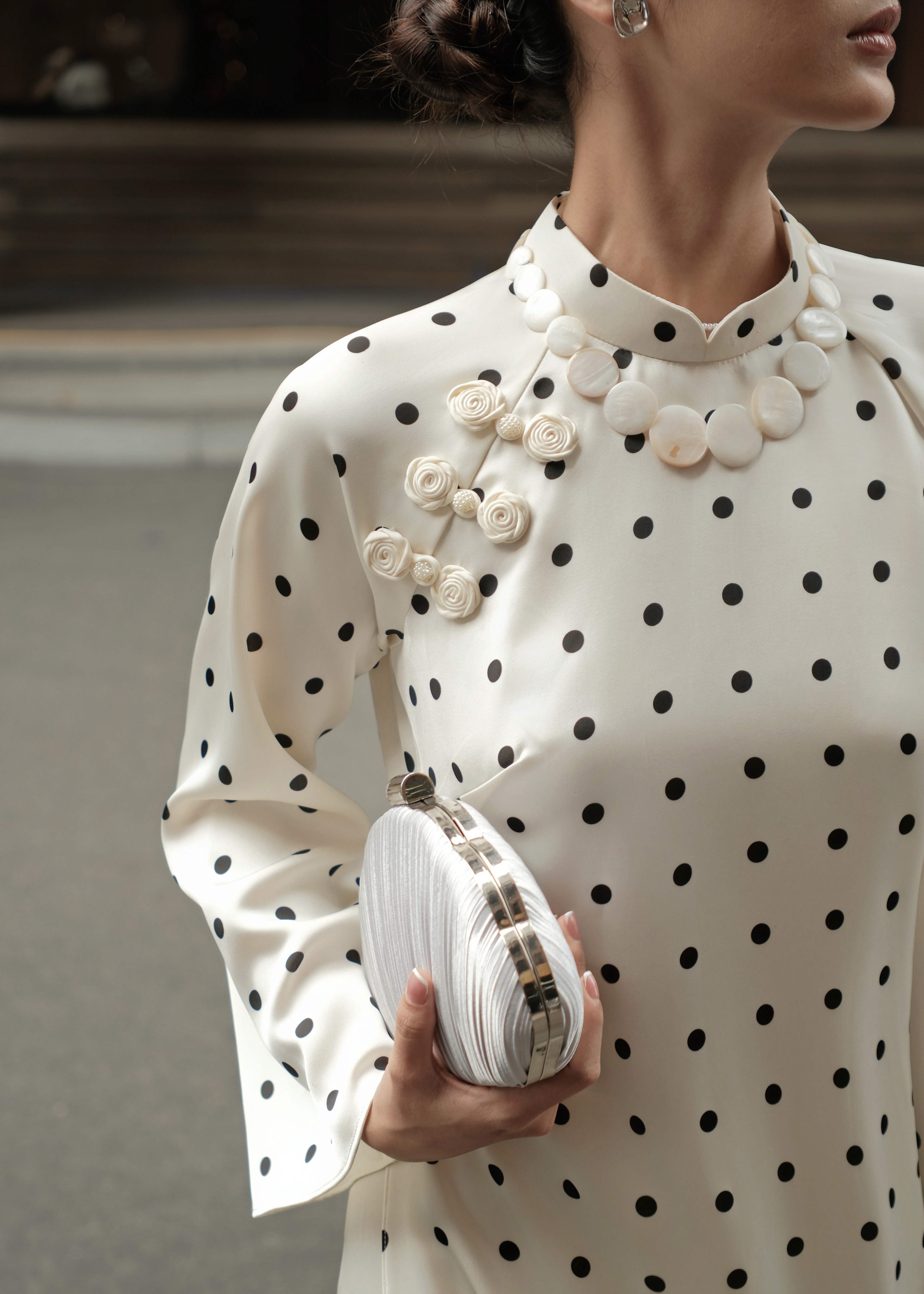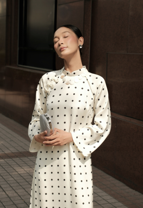 Bạch Ngọc là sự giao thoa tinh tế giữa vẻ đẹp truyền thống và nhịp sống đương đại. Nền lụa trắng ngà điểm chấm bi đen nhỏ nhắn, tối giản nhưng đầy dụng ý, gợi cảm giác thanh khiết như ngọc, sâu lắng mà không phô trương.
