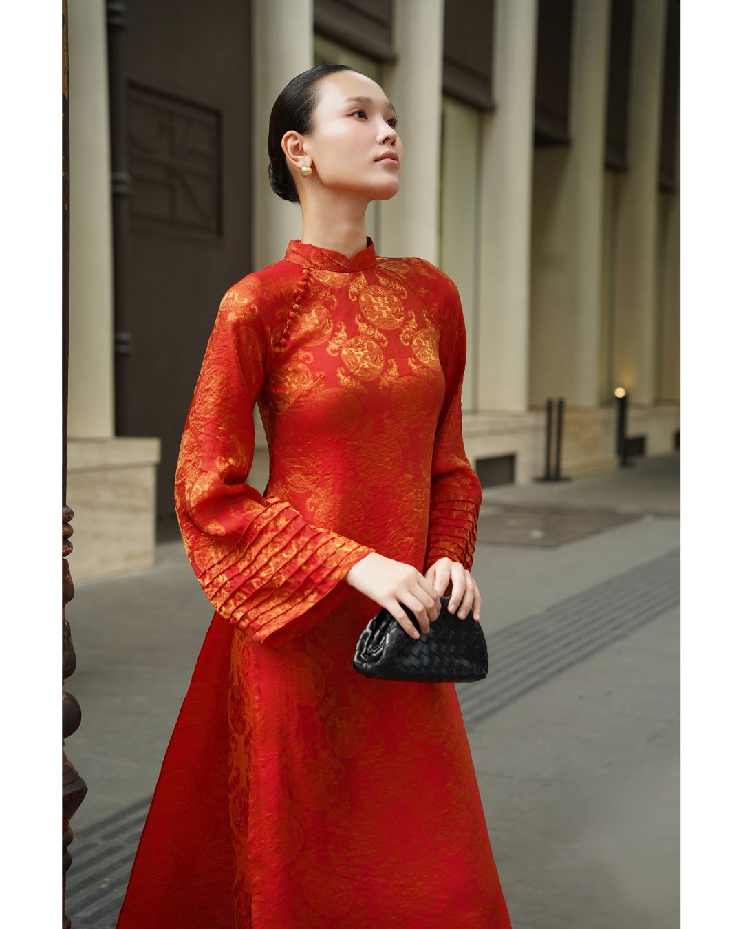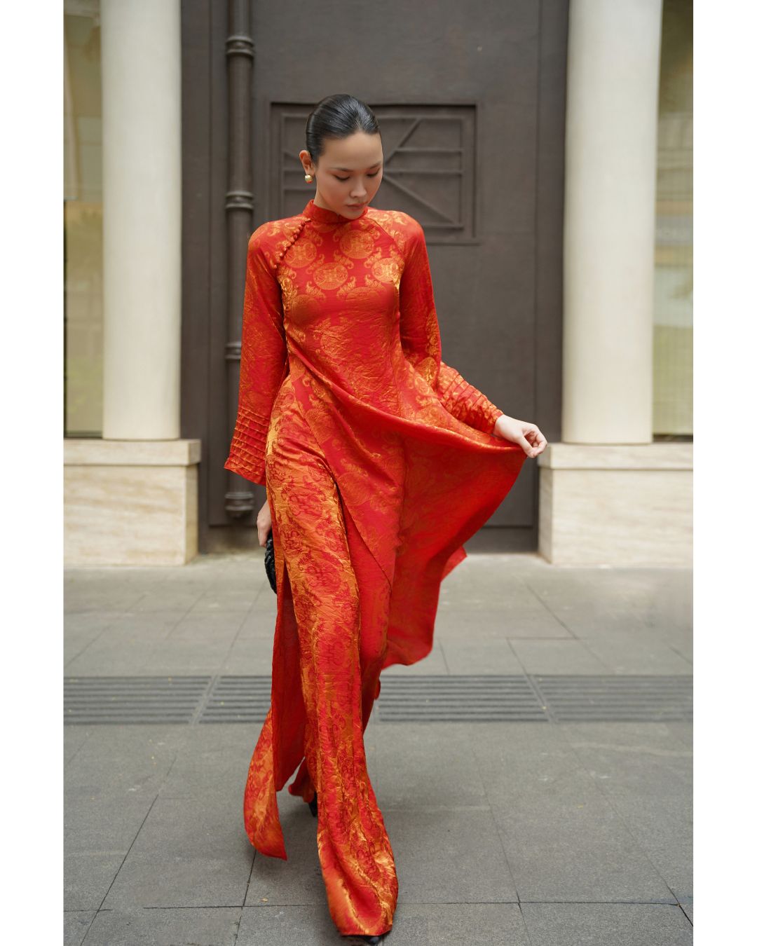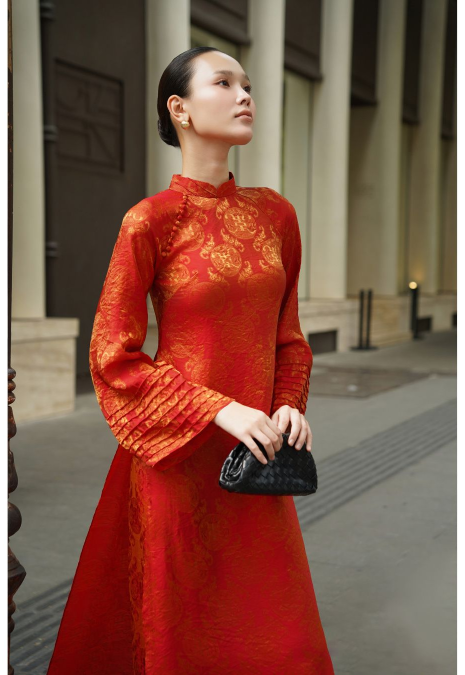 Áo dài được thiết kế theo tinh thần hiện đại, tối giản nhưng vẫn giữ trọn nét duyên dáng truyền thống. Phom dáng suông thanh thoát kết hợp cùng chất liệu lụa mềm mại, mang đến cảm giác nhẹ nhàng, thoải mái và sang trọng khi mặc.