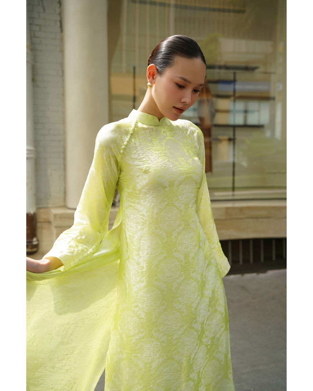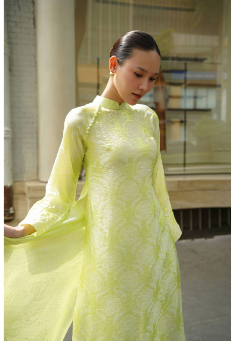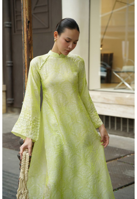 Áo dài được thiết kế theo tinh thần hiện đại, tối giản nhưng vẫn giữ trọn nét duyên dáng truyền thống. Phom dáng suông thanh thoát kết hợp cùng chất liệu lụa mềm mại, mang đến cảm giác nhẹ nhàng, thoải mái và sang trọng khi mặc.