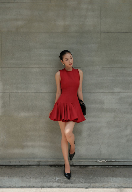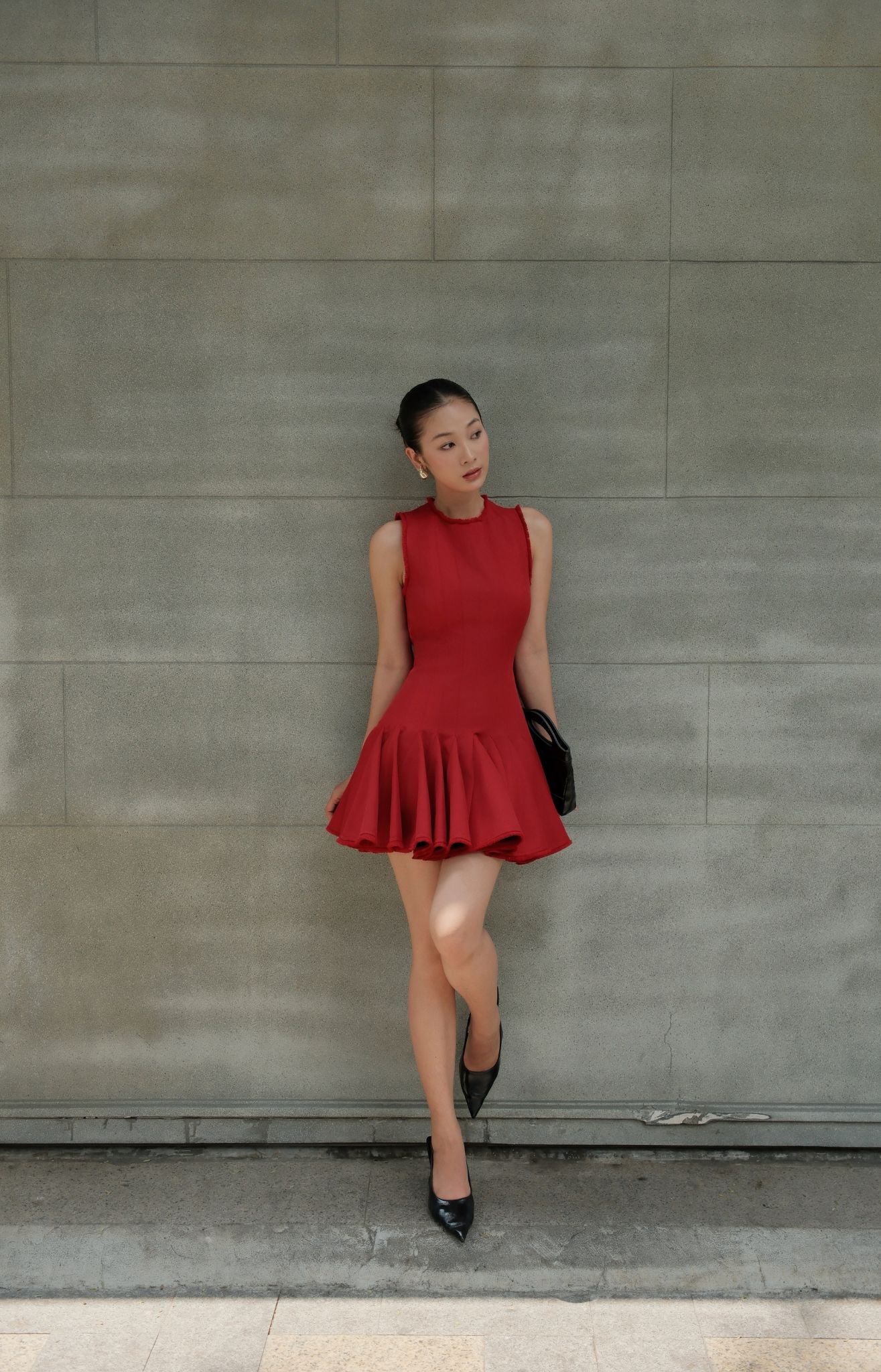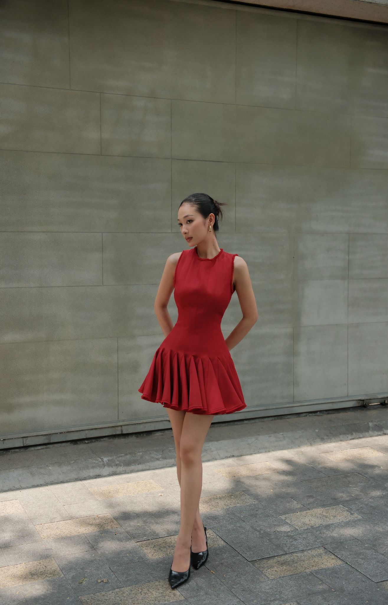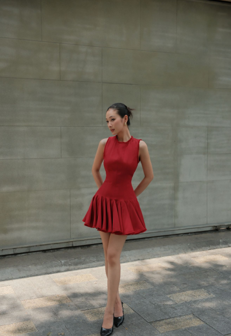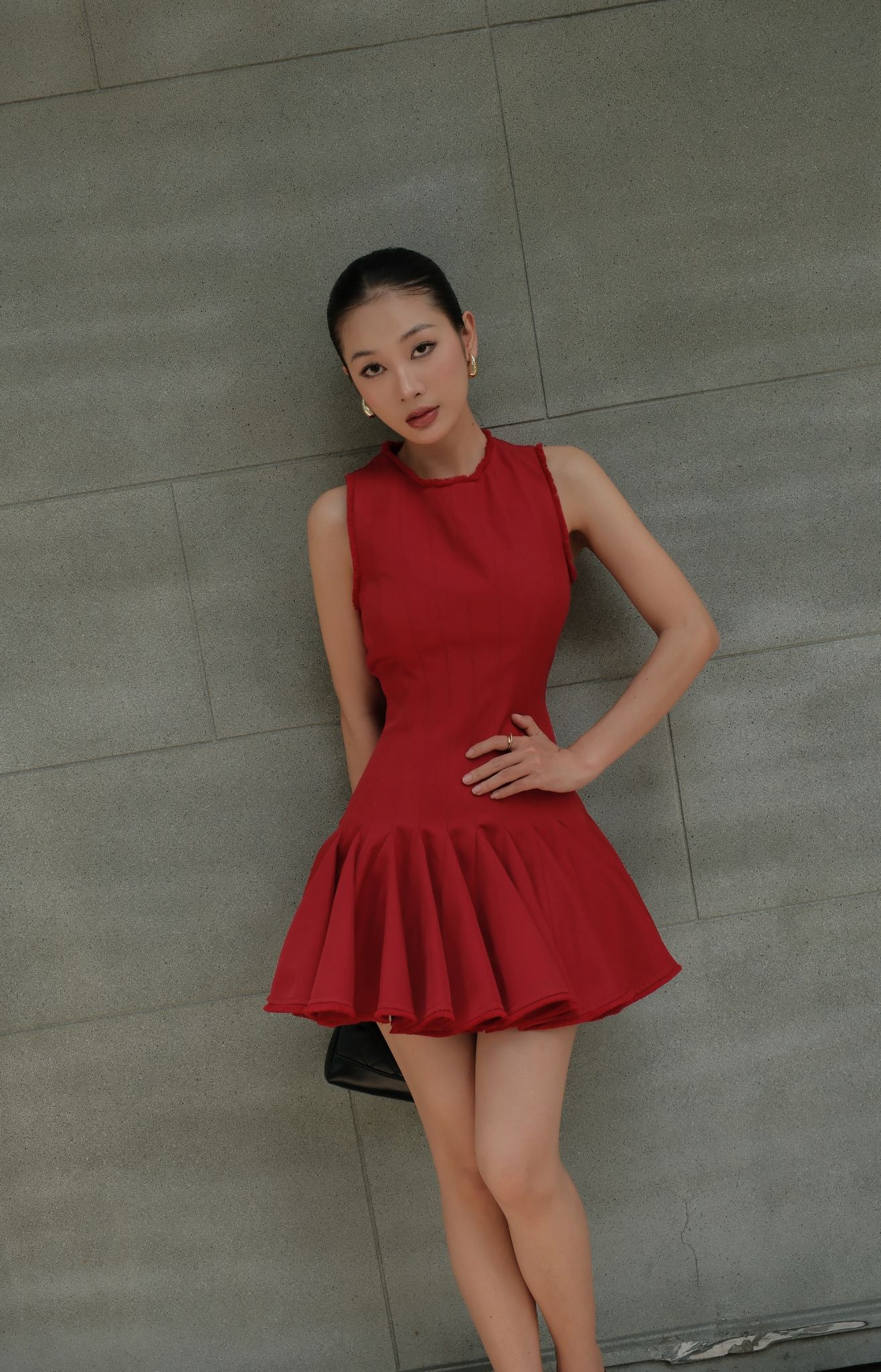 Scarlet Whisper – Nơi sắc đỏ trở nên tinh tế và đầy mê hoặc. Chiếc váy mini không tay với đường may sắc sảo, thân váy ôm nhẹ tôn đường cong tự nhiên và phần chân váy xếp ly bay bổng, viền tua rua mềm mại tạo điểm nhấn hiện đại đầy nghệ thuật.