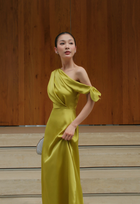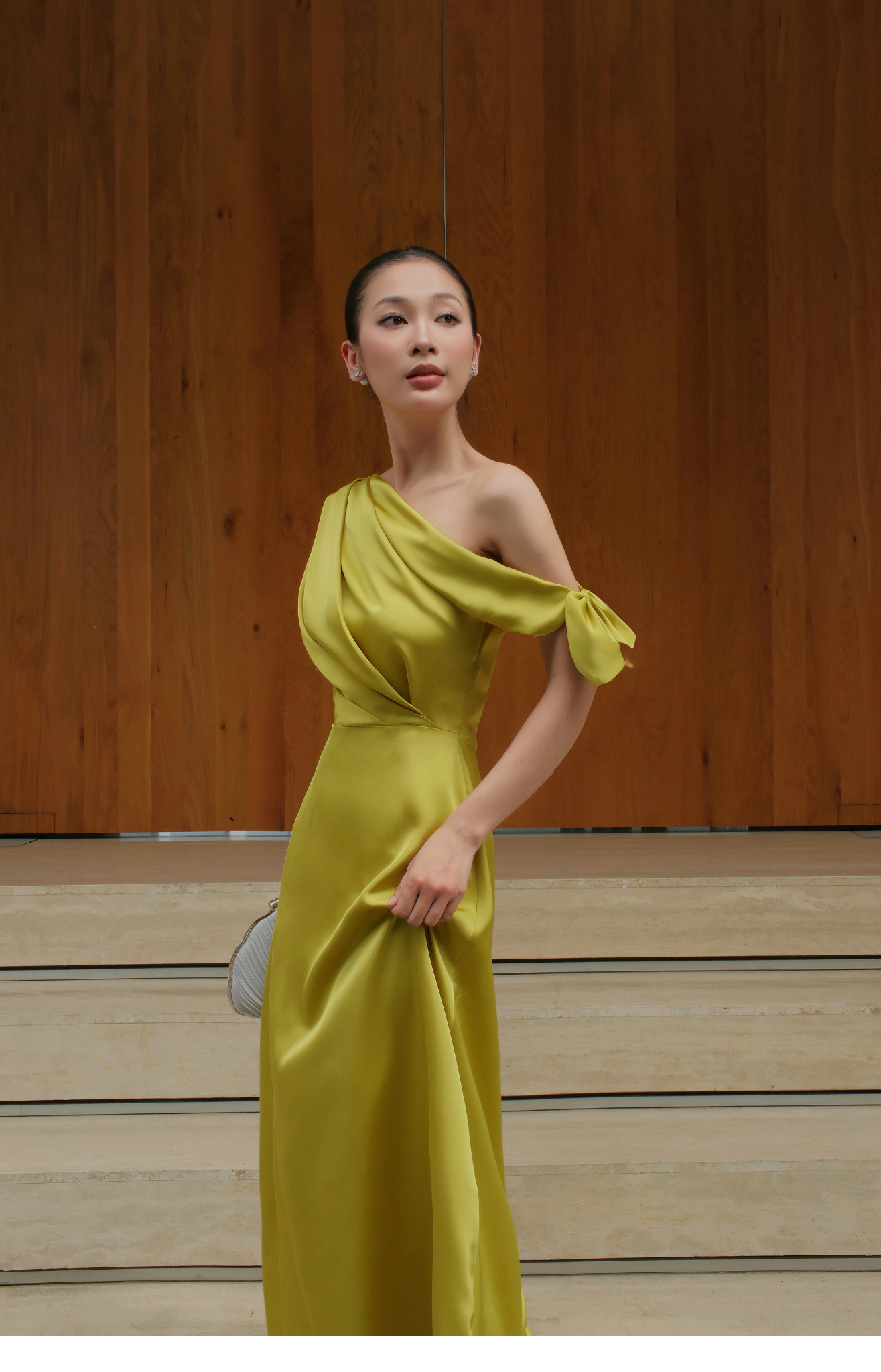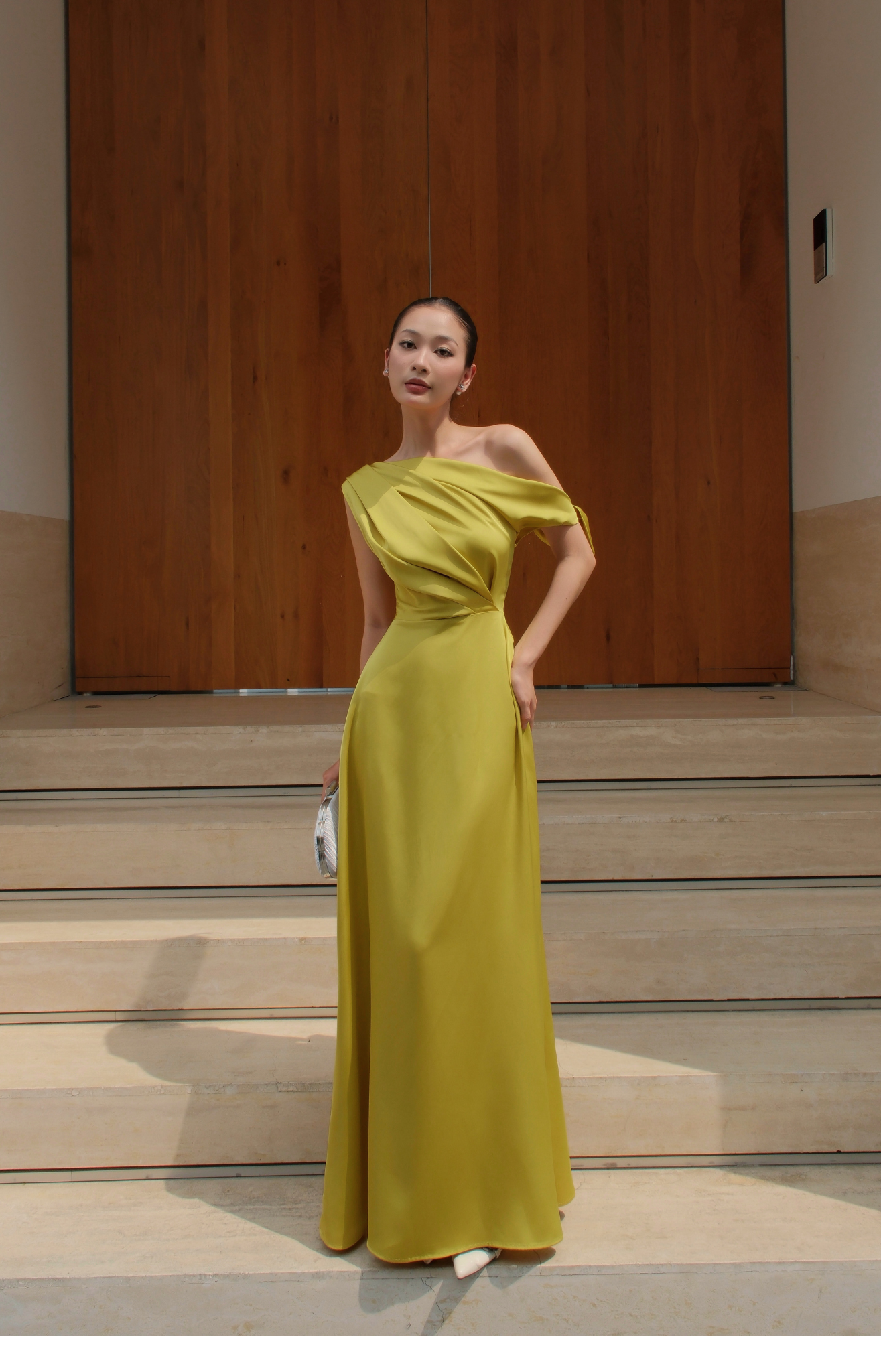 Điểm nhấn nằm ở thiết kế một vai asymmetric đầy quyến rũ, kết hợp cùng kỹ thuật draped mềm mại tại phần ngực và eo, tạo nên những nếp gấp nghệ thuật tôn lên đường cong cơ thể một cách tinh tế và nữ tính. Dáng váy maxi dài chạm sàn mang đến vẻ ngoài quý phái, uyển chuyển trong từng bước di chuyển.
