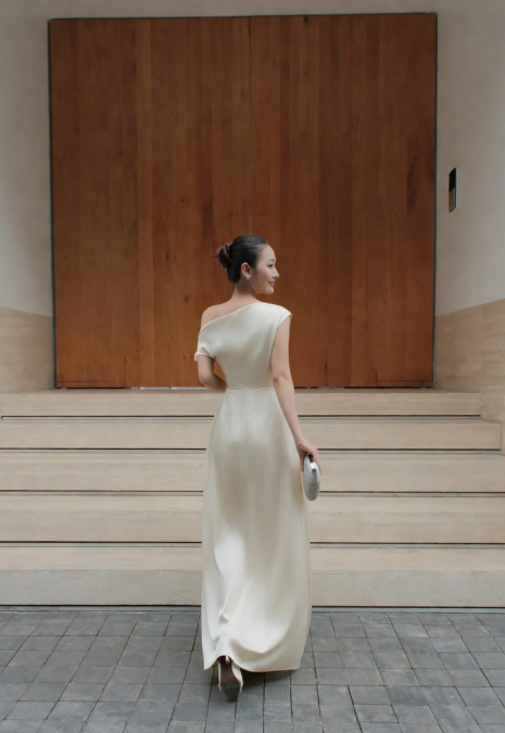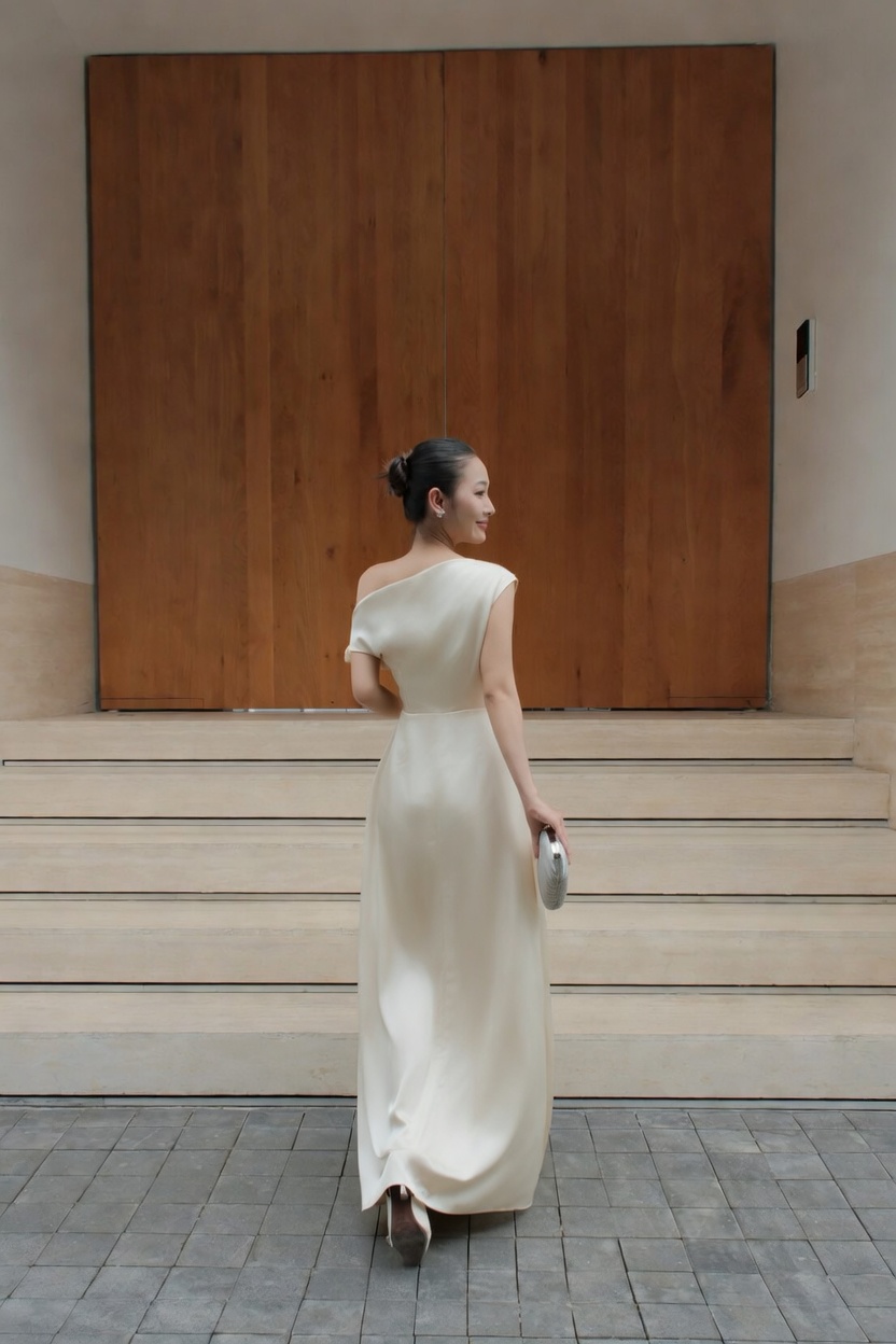 Khám phá chiếc váy maxi satin một vai draped cao cấp màu kem off-white sang trọng. Thiết kế tinh tế, chất liệu satin lụa óng ánh, dáng ôm tôn dáng hoàn hảo cho tiệc cưới, gala và sự kiện thượng lưu.