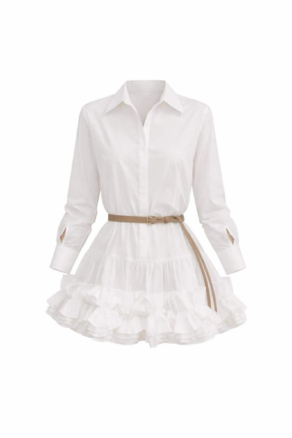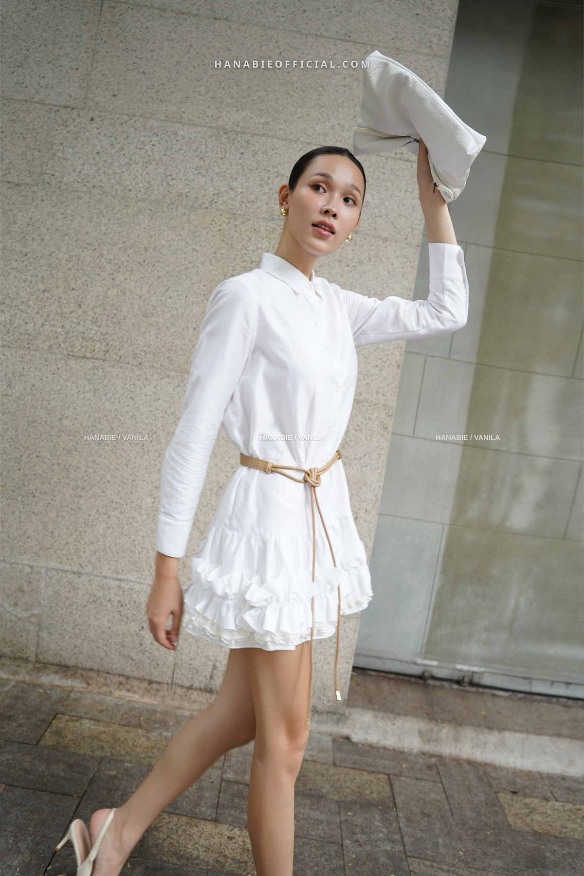 Vanila - chiếc đầm sơ mi tay dài được làm mới bằng chi tiết chân váy bèo nhún tầng, mang đậm tinh thần trẻ trung và thời thượng. Phom dáng ôm nhẹ, chiết eo bằng dây thắt màu nude giúp tôn dáng nhưng vẫn thoải mái vận động.